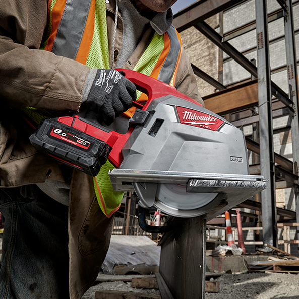 The M18 FUEL™ 203 mm (8”) Metal Cutting Circular Saw generates maximum power for fast cutting, and delivers up to 36 m (120') of cutting corrugated metal sheeting per charge from a M18™ REDLITHIUM™-ION HIGH OUTPUT 8.0Ah battery. Designed to perform in the toughest applications, the M18 FUEL™ 203 mm (8”) Metal Cutting Circular Saw combines performance and durability with the portability of the M18™ platform. The POWERSTATE™ Brushless Motor provides 4,000 RPM and faster cutting performance than corded options. REDLINK™ PLUS Intelligence ensures maximum performance and protection from overload, overheating, and over-discharge. With onboard chip collection, the jobsite is left free of chips, and the collected chips are easy to dispose of. When paired with a M18™ REDLITHIUM™-ION HIGH OUTPUT 8.0Ah battery (not included), the user gets 50% more power while running 50% cooler than a M18™ REDLITHIUM™-ION 5.0Ah Battery. This metal circular saw has a cut capacity of 66 mm (2-9/16”) for tackling demanding applications with a larger capacity than any previous cordless metal cutting circular saw.