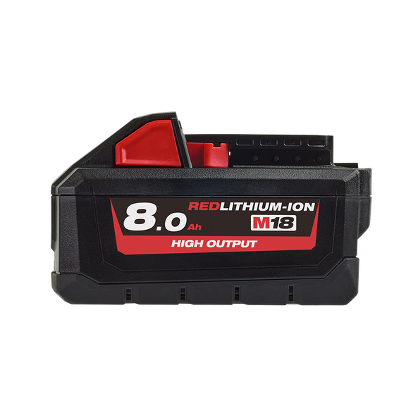 Our M18™ REDLITHIUM™-ION HIGH OUTPUT™ 8.0Ah Battery provides you with 50% more power and runs 50% cooler than our other M18™ REDLITHIUM™-ION battery packs. The optimised combination of smaller size and increased power of the 18-volt battery provides you with a great solution for the entire range of M18 products. The lithium-ion battery delivers fade-free power and runs substantially cooler through heavy applications, allowing you to push your cordless power tools throughout a wide application range. The M18™ REDLITHIUM™-ION HIGH OUTPUT™ 8.0Ah Battery provides you with increased power in extreme cold weather conditions (below -18°C) and delivers more work per charge, driving corded replacement. The M18™ REDLITHIUM™-ION HIGH OUTPUT™ 8.0Ah Battery is fully compatible with all 150+ MILWAUKEE M18™ solutions.